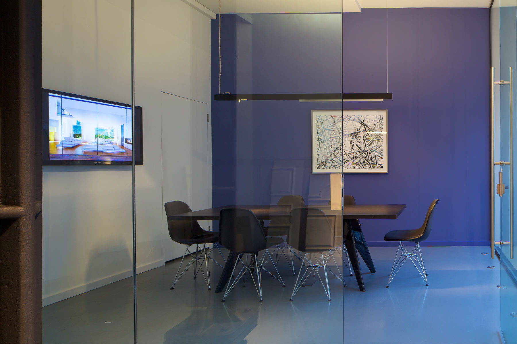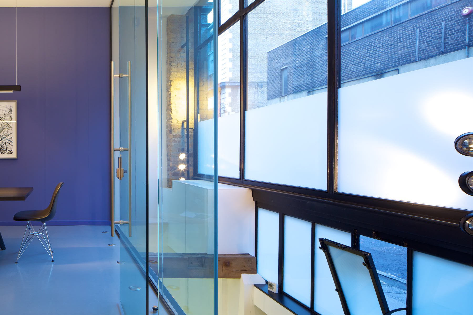 Before moving to Highbury, HWO’s offices were located in a converted warehouse in Clerkenwell, east London. The challenge was to create a reception and meeting room on the ground floor while the lower level was still in use. Planning consent was obtained for timber louvres that would complement the original shopfront. The existing fit-out was stripped and the original features, including a cast iron column and brickwork, were brought back to life. A 3.4m floor-to-ceiling glass partition was installed, and a bulkhead built to conceal air conditioning. Viabizzuno lighting is controlled via specialist dimming gears.
