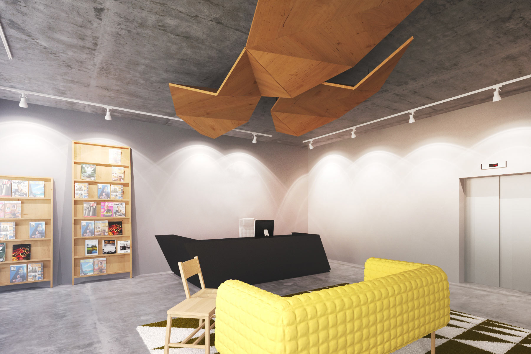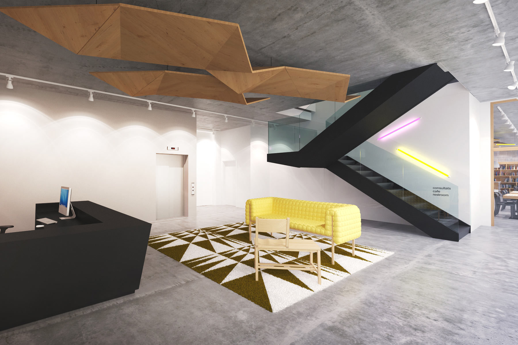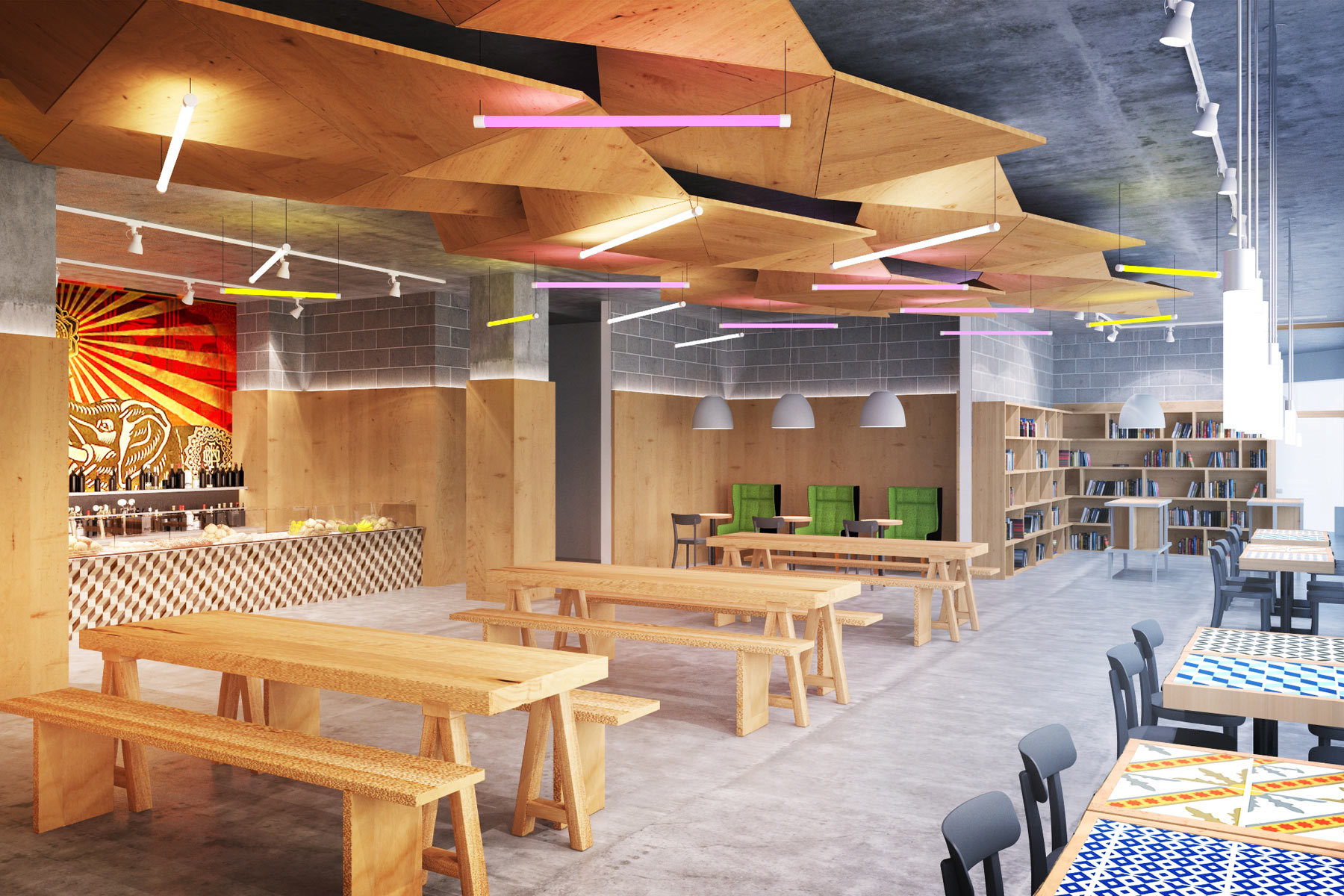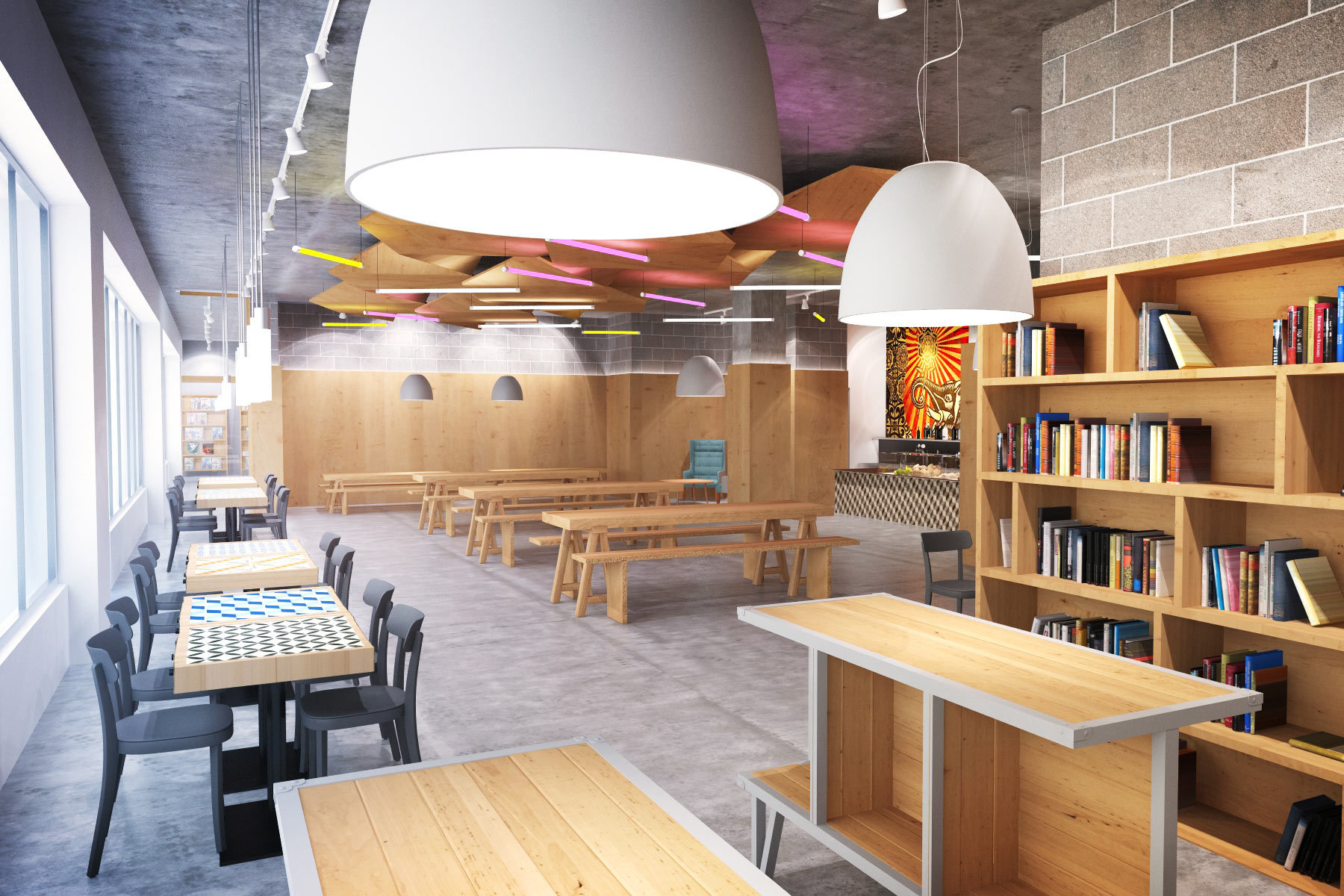 This proposal for a café on the ground floor of a 38,000 sq ft building mixes art, casual dining and long bench-style tables.