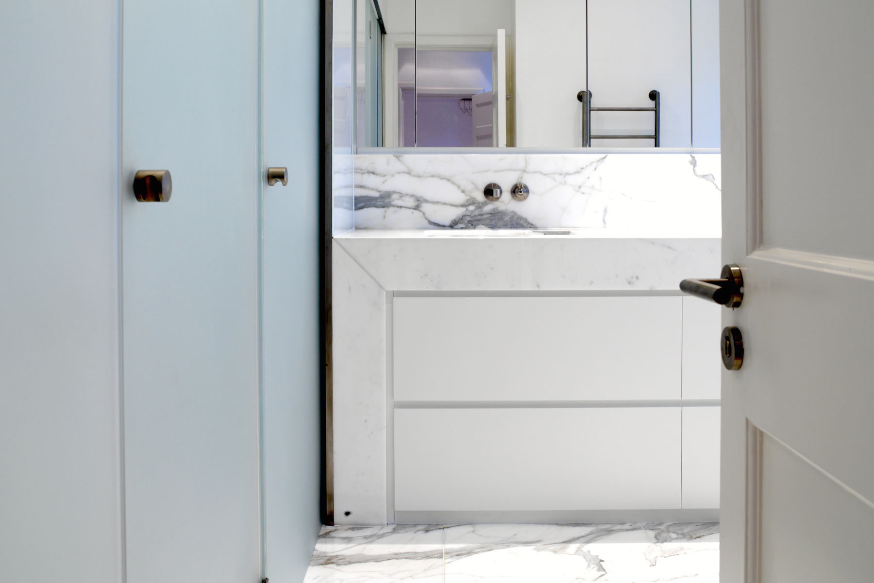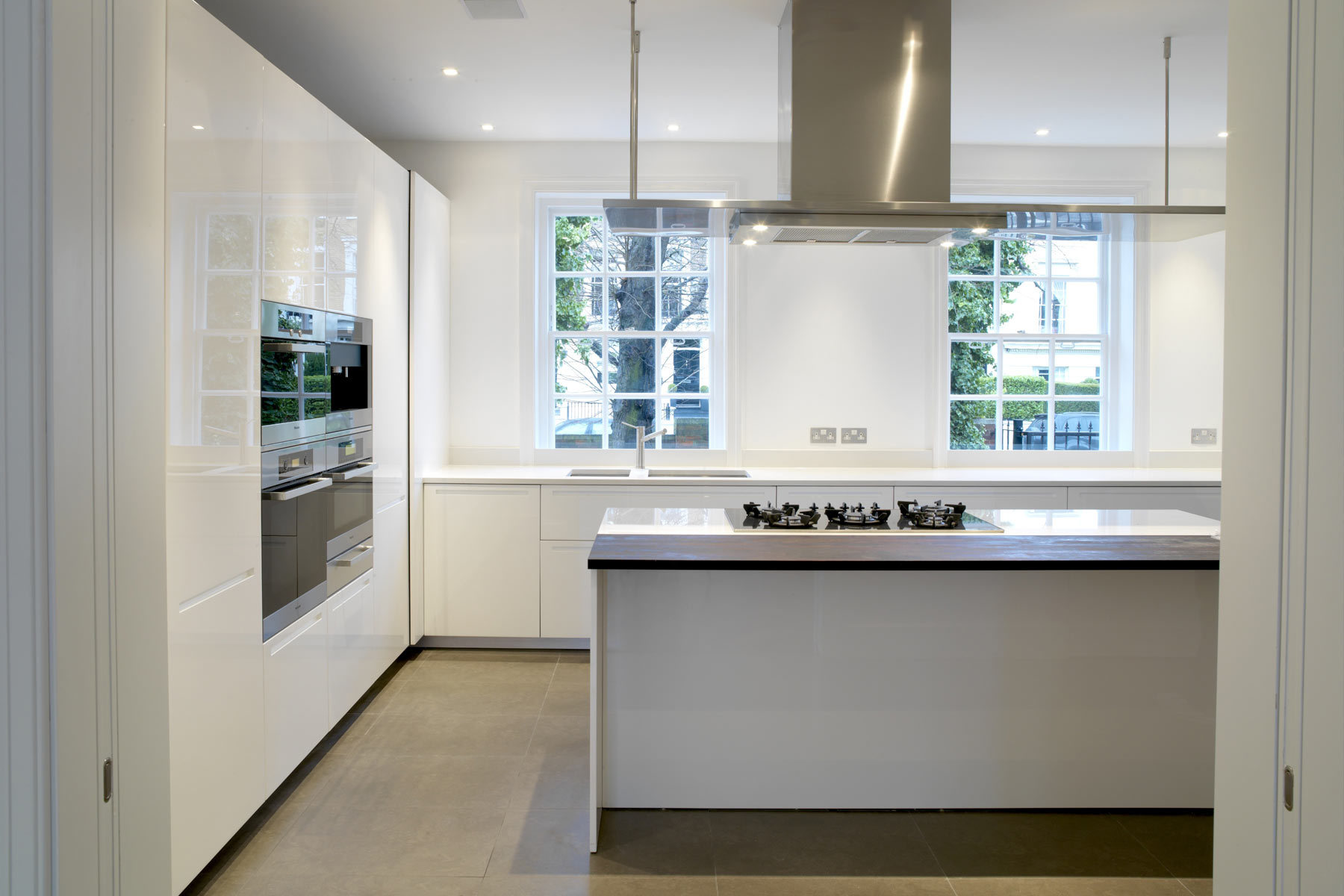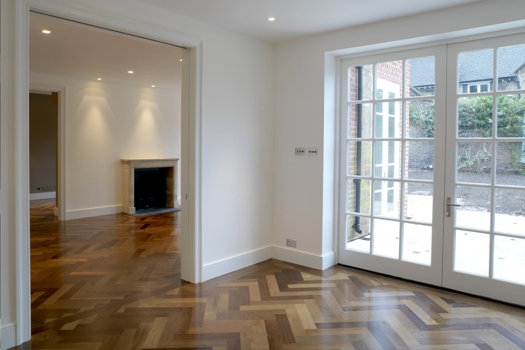 The complete refurbishment of this 1930’s detached house in St Johns Wood included extensive structural works, high quality finishes and fittings to the exacting client specifications. The main challenge was to re-arrange the distribution of rooms in the house, moving the kitchen from the rear to the front and extending the living room using permitted development rights. To achieve an open ground floor we had to invent a fire alarm linked sliding door on a pulley system which was successfully passed by the building control officer. The ground floor parquet was a smoked oak herringbone laid on an engineered board. Achieving the right colour required several sample panels. The master bathroom was fitted with book matched carrara marble cut from one block.
