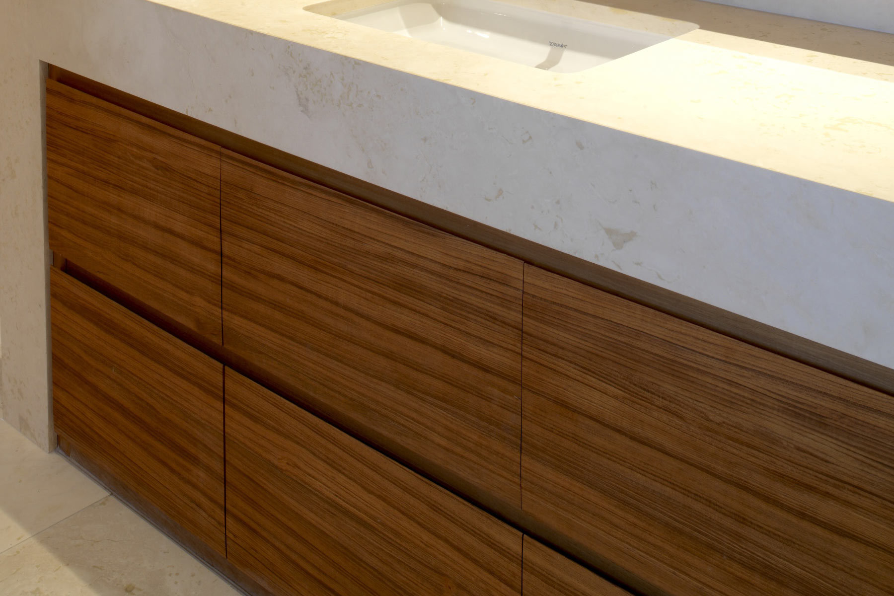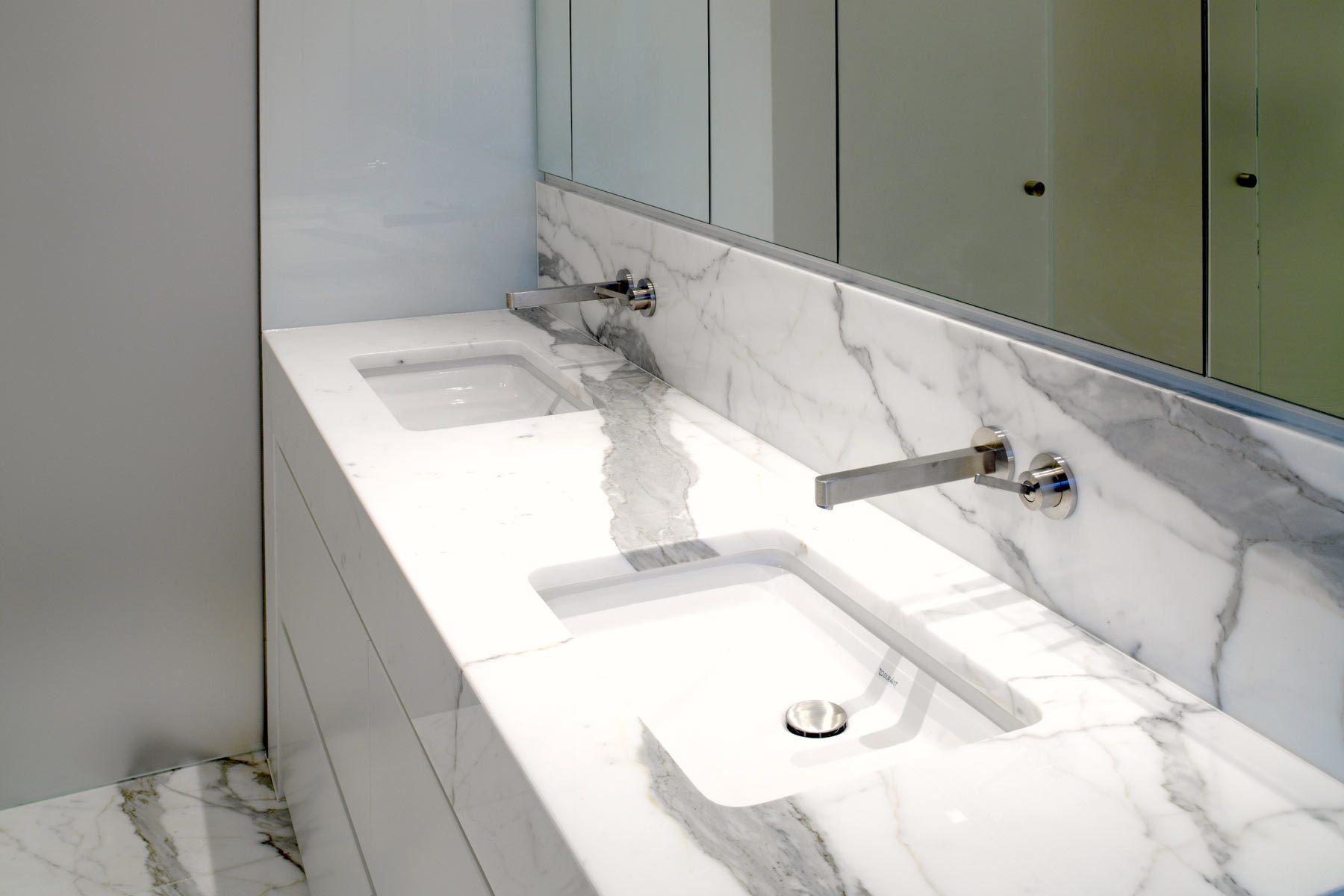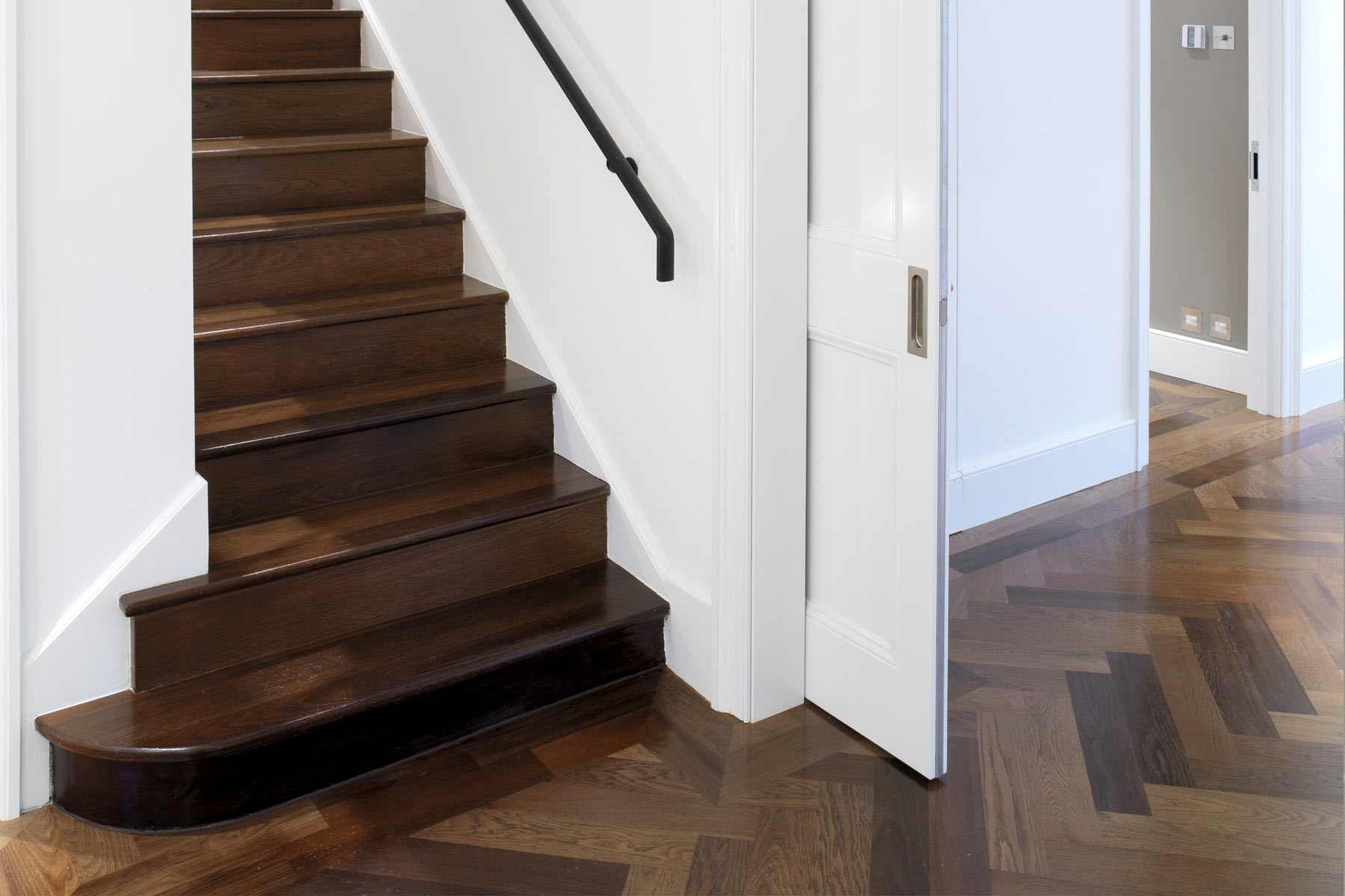 The complete refurbishment of this 1930’s detached house in St Johns Wood included extensive structural works, high quality finishes and fittings to the exacting client specifications. The main challenge was to re-arrange the distribution of rooms in the house, moving the kitchen from the rear to the front and extending the living room using permitted development rights. To achieve an open ground floor we had to invent a fire alarm linked sliding door on a pulley system which was successfully passed by the building control officer. The ground floor parquet was a smoked oak herringbone laid on an engineered board. Achieving the right colour required several sample panels. The master bathroom was fitted with book matched carrara marble cut from one block.